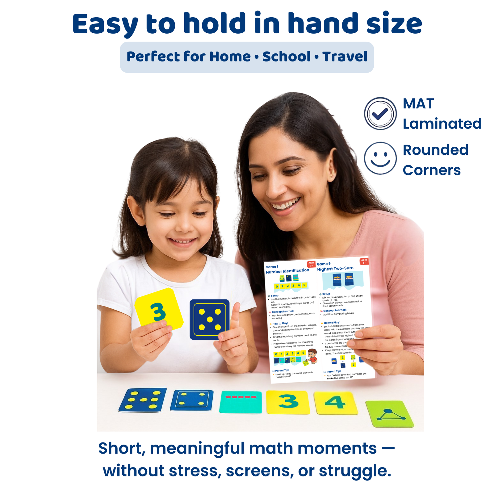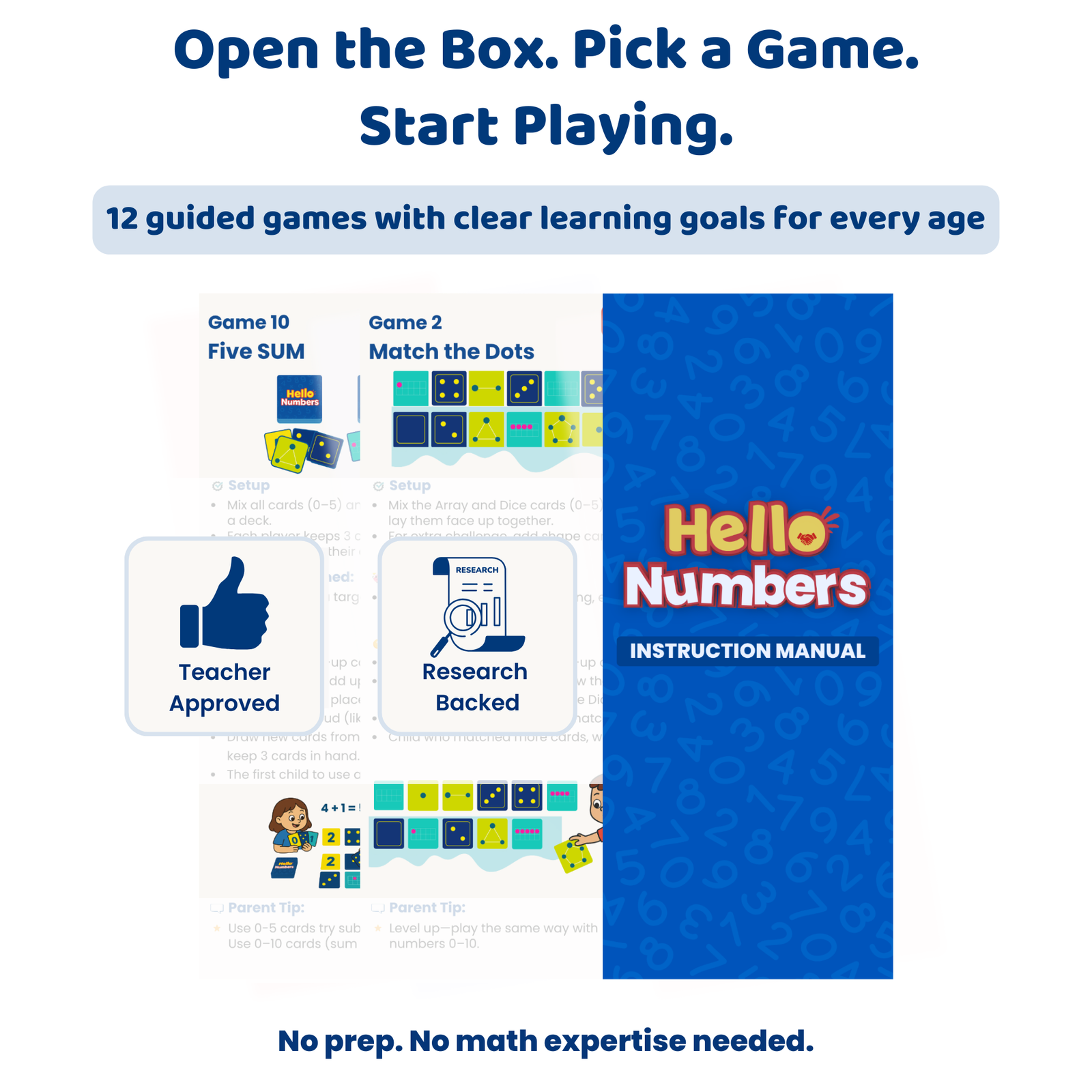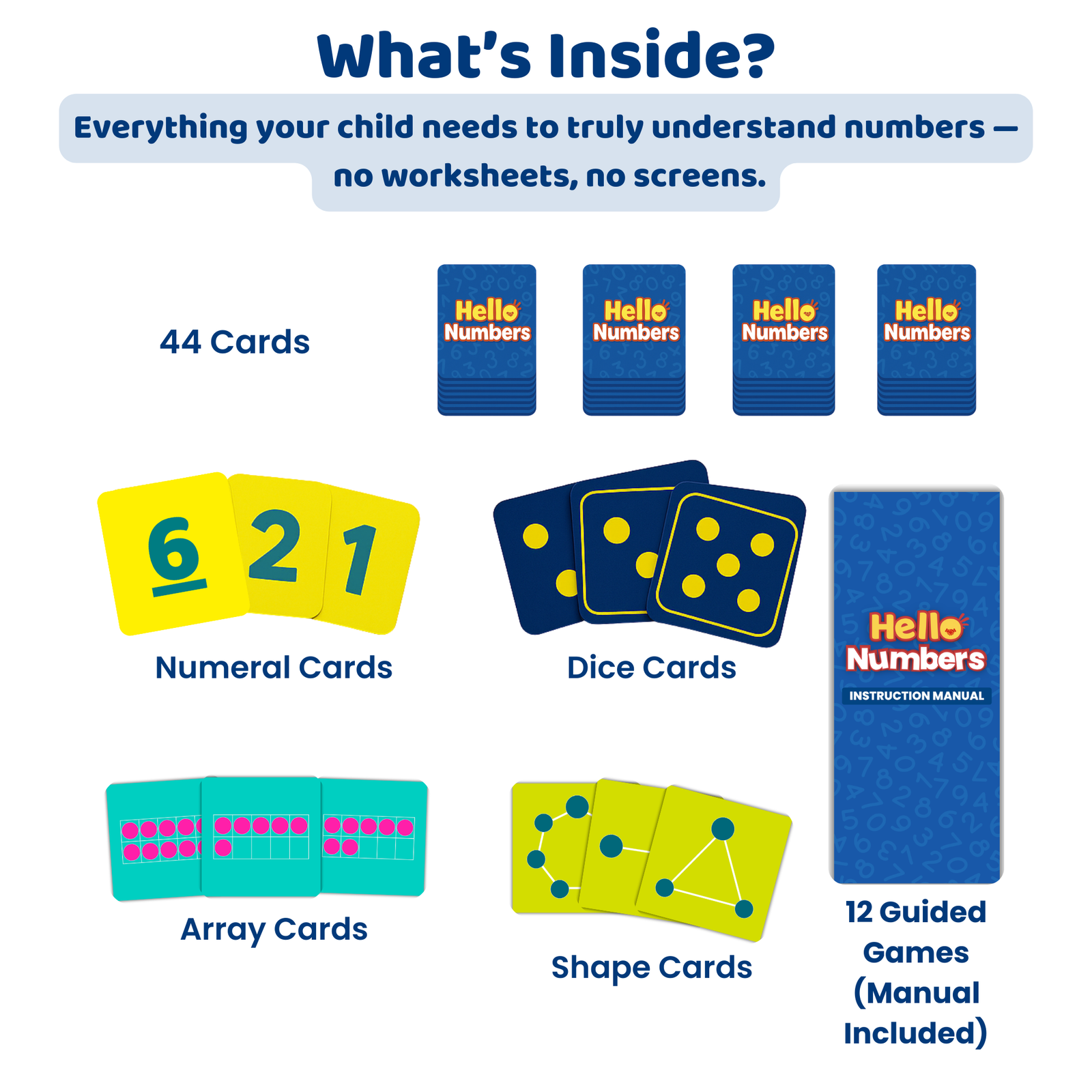 Make early math joyful and confident. Hello Numbers turns traditional number learning into an interactive adventure. This set of 44 premium math flash cards and a 12-game research-backed manual teaches counting, addition, matching, and pattern sense — all 100% screen-free.