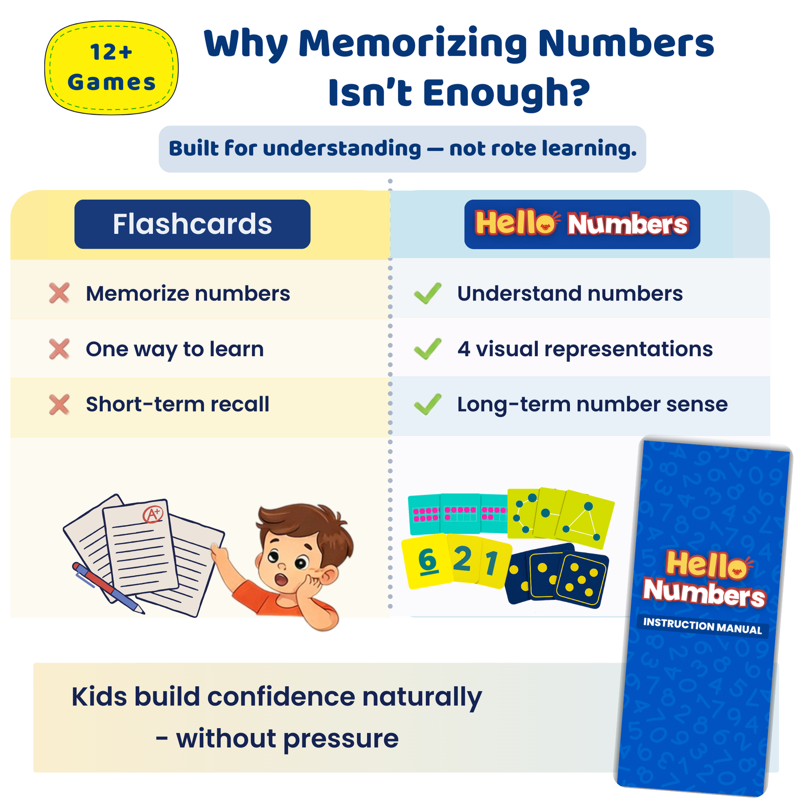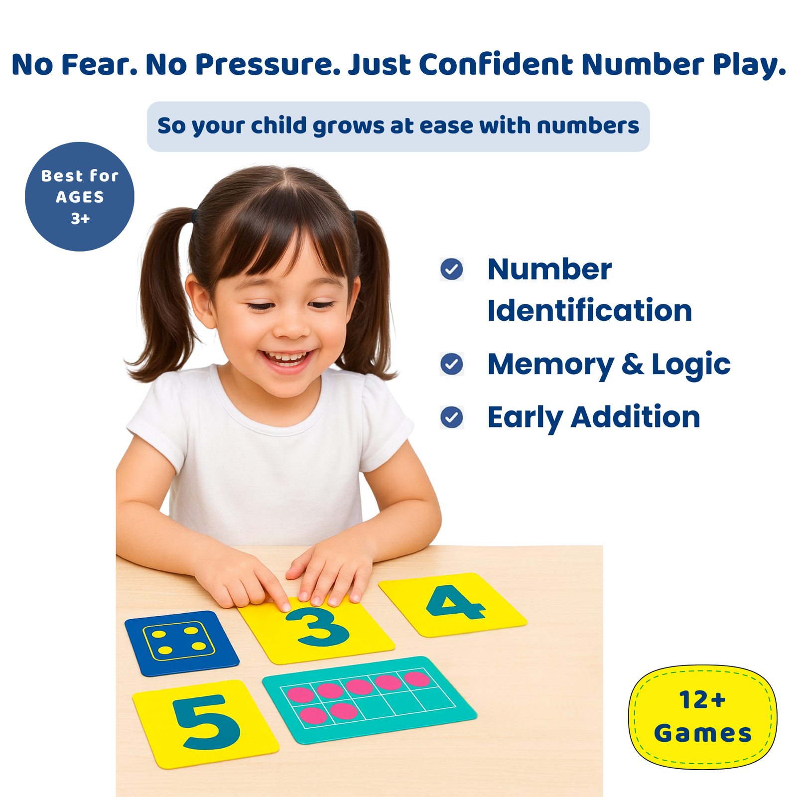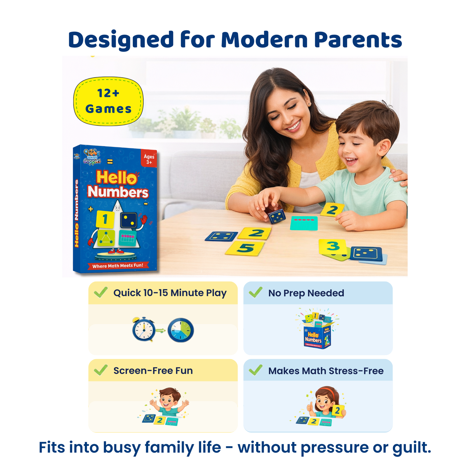 Make early math joyful and confident. Hello Numbers turns traditional number learning into an interactive adventure. This set of 44 premium math flash cards and a 12-game research-backed manual teaches counting, addition, matching, and pattern sense — all 100% screen-free.