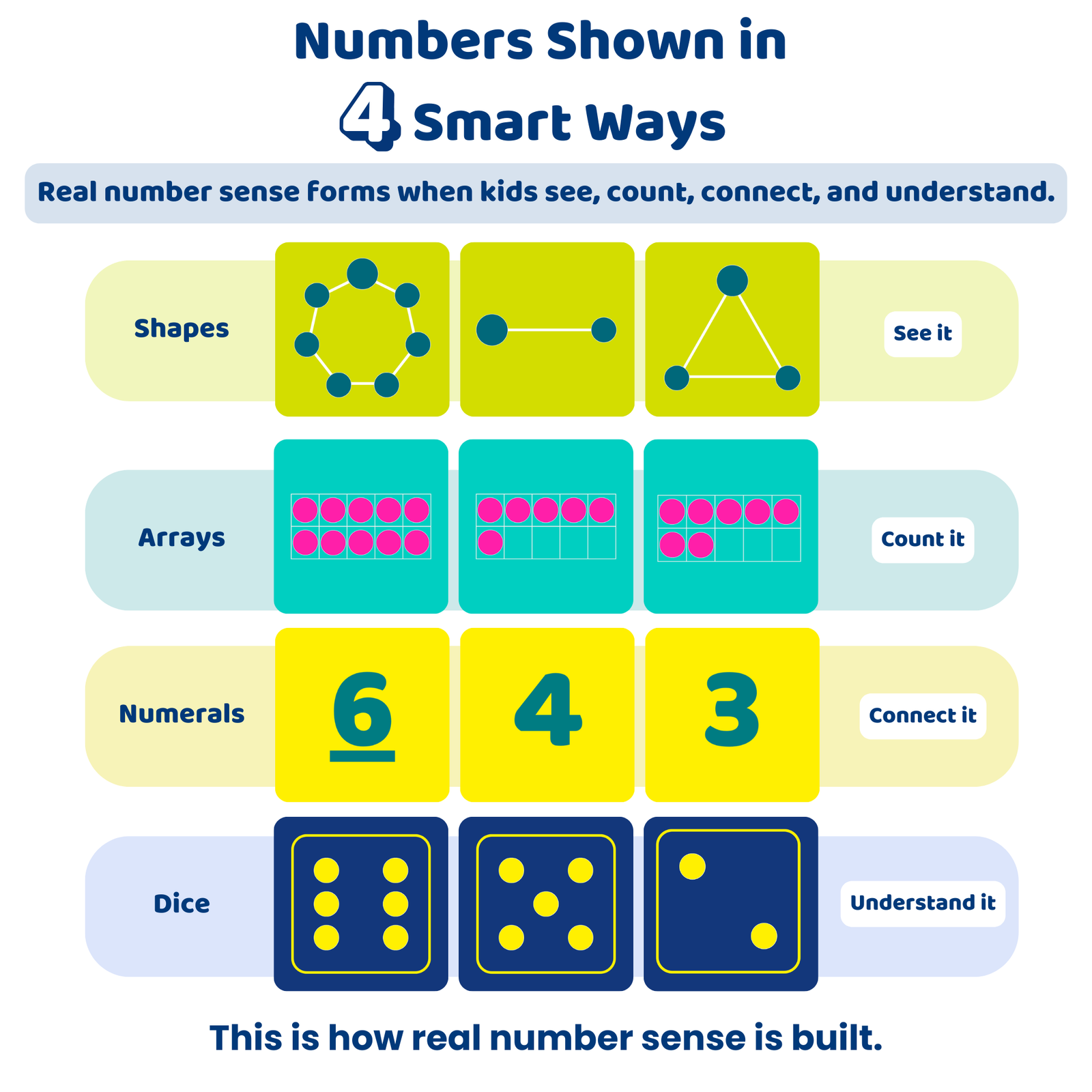 - Beyond Basic Memorization: Numbers shown in four ways — numerals, dice dots, arrays, and shapes — so children truly understand the “how” and “why” of quantity.